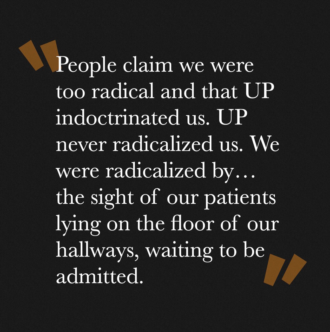 To my fellow graduates, as we leave the halls of Calderon and PGH and pursue our chosen tracks be it in specialized training, primary health care and public health, research, the academe, or public administration – may we always be reminded of the students we used to be. We were able to ace our examinations and OSCEs, case presentations and journal appraisals. But we were also the students who took to the streets when the dictator Marcos was buried at the Libingan ng mga Bayani because we believed historical revisionism was a disease that needed to be confronted. We held the banner that said “Heal the Nation, Fight Tyranny” when we rallied against state-sponsored atrocities and thousands of extrajudicial killings because we believed that drug addiction is a public health issue that fascism never heals. We issued a statement against the Anti-Terrorism Law because we believed that acts of dissent should never be criminalized, especially when it’s targeted at public policies which further burden and endanger the lives of the poor. We left our classrooms when we realized we were needed in the streets. People claimed we were too radical and that UP indoctrinated us. But UP never radicalized us. We were radicalized by the long lines outside the OPD at 2am, insufficient oxygen tanks in the ACU, the sight of our patients sitting down or lying on the floor of our hallways, waiting to be admitted. We were radicalized by the fact that every single day, thousands of our healthcare workers seek better job opportunities abroad because of the poor working conditions this country offers them. Our country’s leaders attack our actions, yet their corruption and heartlessness created the conditions of our radicalism.