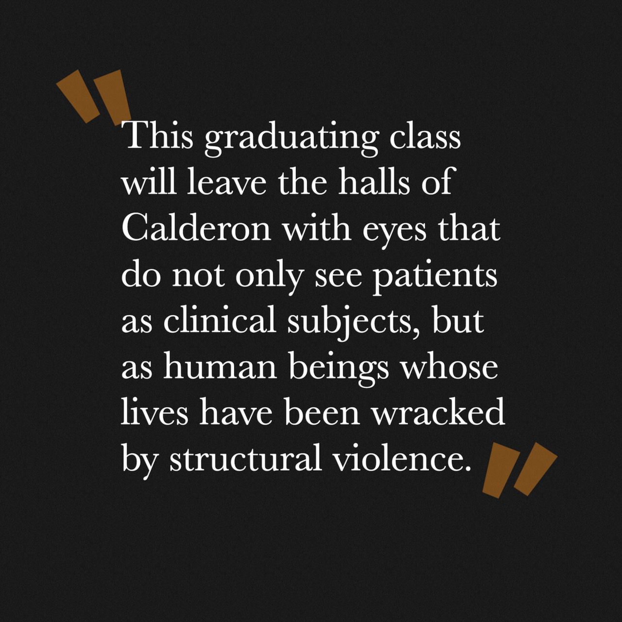 Classmates, may we find the essence of what it means to be a physician in a country plagued by social illnesses. To be a Filipino, Indigenous, and Moro doctor is to stand alongside our patients in our struggle towards what ensures health for all: social justice. Our coats and MDs mean nothing if we remain silent in the face of inequalities. My white coat would have meant nothing if I had not learned of the daily life of the kuya who sold me squid balls and the ate who made my egg sandwiches. And so, may we not only have clinical eyes that see signs of diseases, but critical eyes that see the signs of violence and injustices in the conditions of the people we meet, the very people whose taxes and labor sustained our medical education. Let us never lose sight of our goals and continue to allow compassion and empathy to drive our responsibility to serve the underserved. As Che Guevara: a peoples’ doctor, and prominent socialist once said, “The true revolutionary is guided by great feelings of love.”