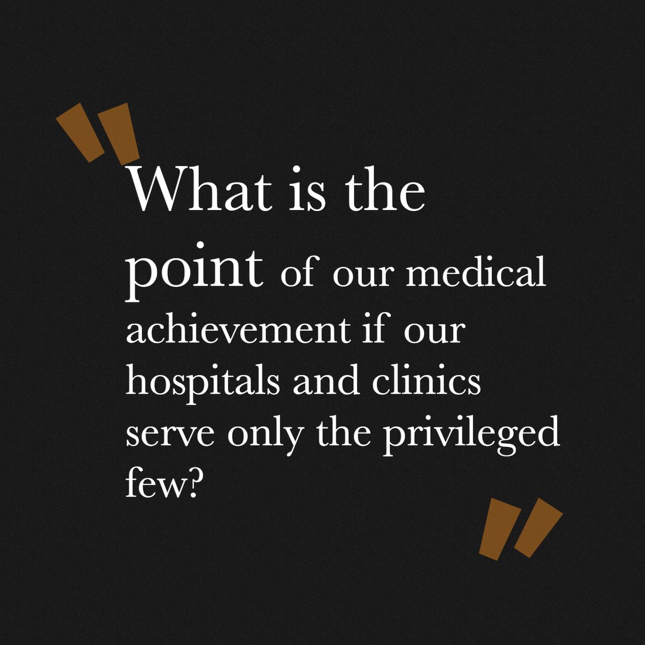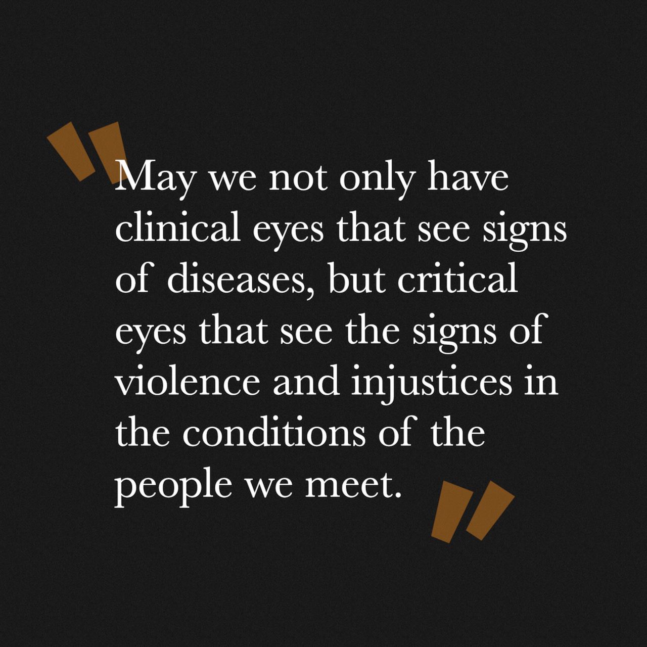 A good med student does not regard medicine as a mere classroom exercise or clinical exam to accomplish. A good med student recognizes that the practice of medicine goes beyond the classrooms and hospitals, a practice that inevitably extends to a world where street vendors, contractual grocery workers and informal settlers fight for survival -- a world where the root illnesses of our country are neither biological nor pathological, but socially-created and enforced.