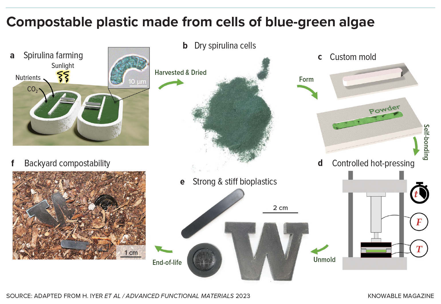 Roumeli, for example, has mined the promise of algal cells. They’re small, and therefore easily manipulable; they contain large amounts of proteins, which are biological polymers, alongside other useful materials. She and her students took powdered algae and passed it through a hot presser. After several trials in which they varied the pressing time, temperature and the amount of pressure applied — all of which affect the way the molecules bond — they found they could produce a material that was stronger than many commodity plastics.