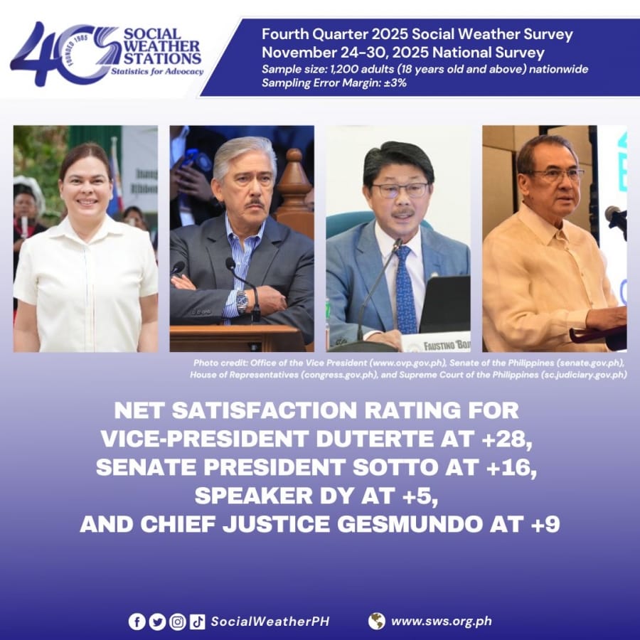 The national Social Weather Survey of November 24-30, 2025, the most recent quarterly national survey finalized by SWS, found 54% satisfied and 26% dissatisfied with the performance of Vice-President Sara Duterte, 46% satisfied and 30% dissatisfied with Senate President Vicente ''Tito'' Sotto III, 33% satisfied and 28% dissatisfied with Speaker Faustino ''Bojie'' Dy III, and 36% satisfied and 27% dissatisfied with Chief Justice Alexander Gesmundo [Table 1].